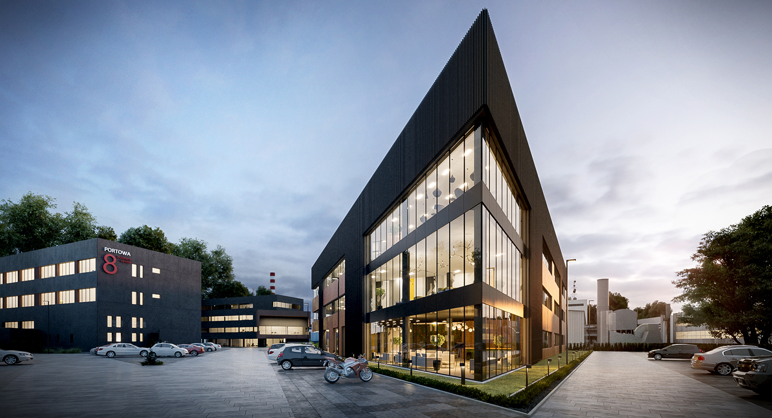 Projektując budynek biurowy przy ul. Portowej w Gliwicach, postawiliśmy na dynamiczną, nieregularną bryłę, która wyróżnia się w miejskim krajobrazie. Trzykondygnacyjny obiekt obłożono czarnymi pionowymi żyletkami, które nadają mu wertykalny charakter i podkreślają smukłość formy. Kontrastującym akcentem jest wykończenie z blachy cortenowej – materiału o szlachetnej, zmiennej barwie, który nadaje całości elegancji i unikatowego wyrazu.
