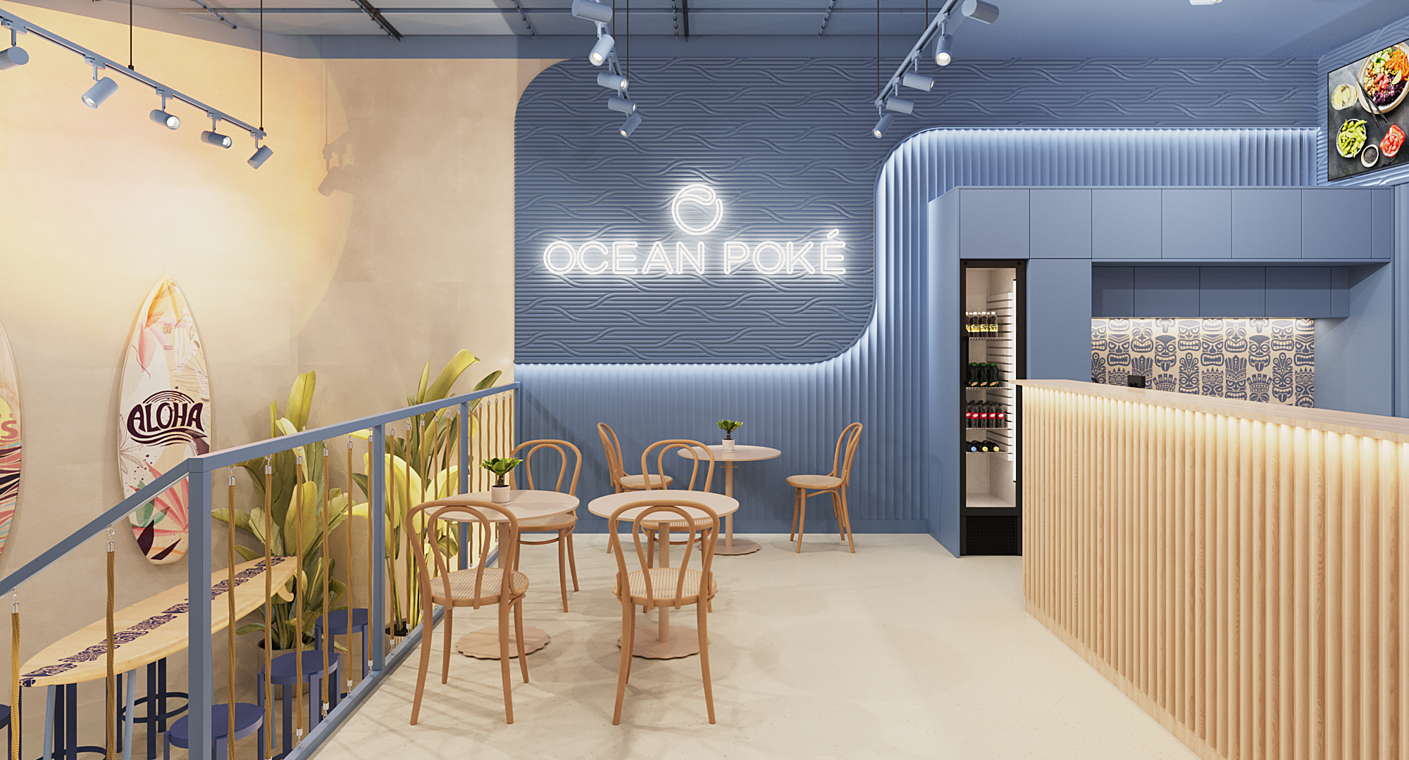 Ocean Poke to nowy lokal gastronomiczny na kulinarnej mapie Warszawy, którego specjalnością jest kuchnia hawajska. Projekt wnętrza powstał z myślą o stworzeniu miejsca przywołującego atmosferę tropikalnej plaży i pozwalającego na chwilę oderwać się od miejskiego rytmu. Motywem przewodnim aranżacji jest kolor niebieski symbolizujący ocean. Pojawia się on zarówno na ścianach, jak i na suficie, budując spójną, immersyjną przestrzeń. Jego charakter podkreślają zaoblone linie oświetlenia LED, które subtelnie podświetlają powierzchnie i tworzą wrażenie falującej wody. Światło odbijające się od niebieskich płaszczyzn daje efekt delikatnego ruchu, przywołując skojarzenia z powierzchnią oceanu.