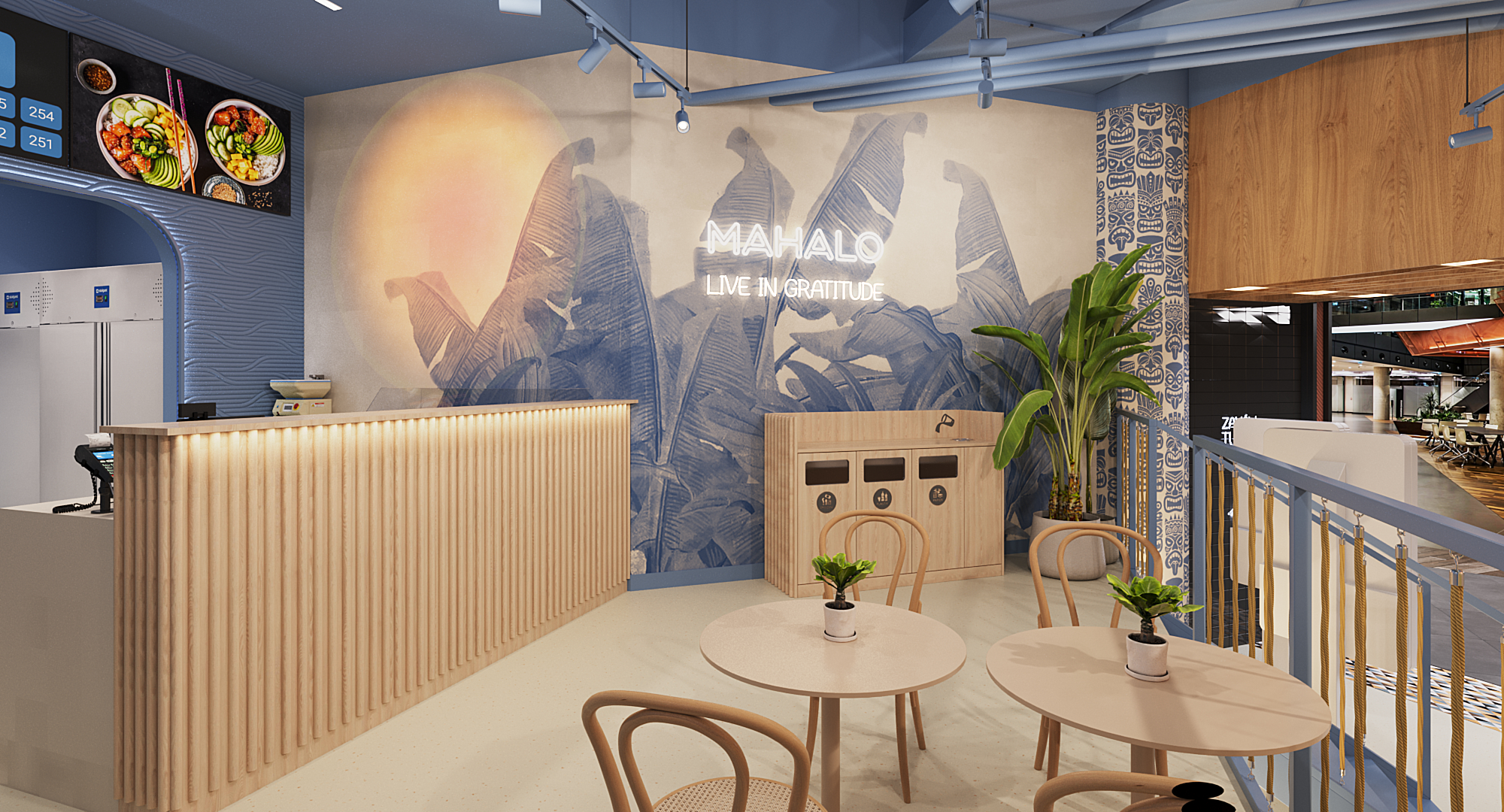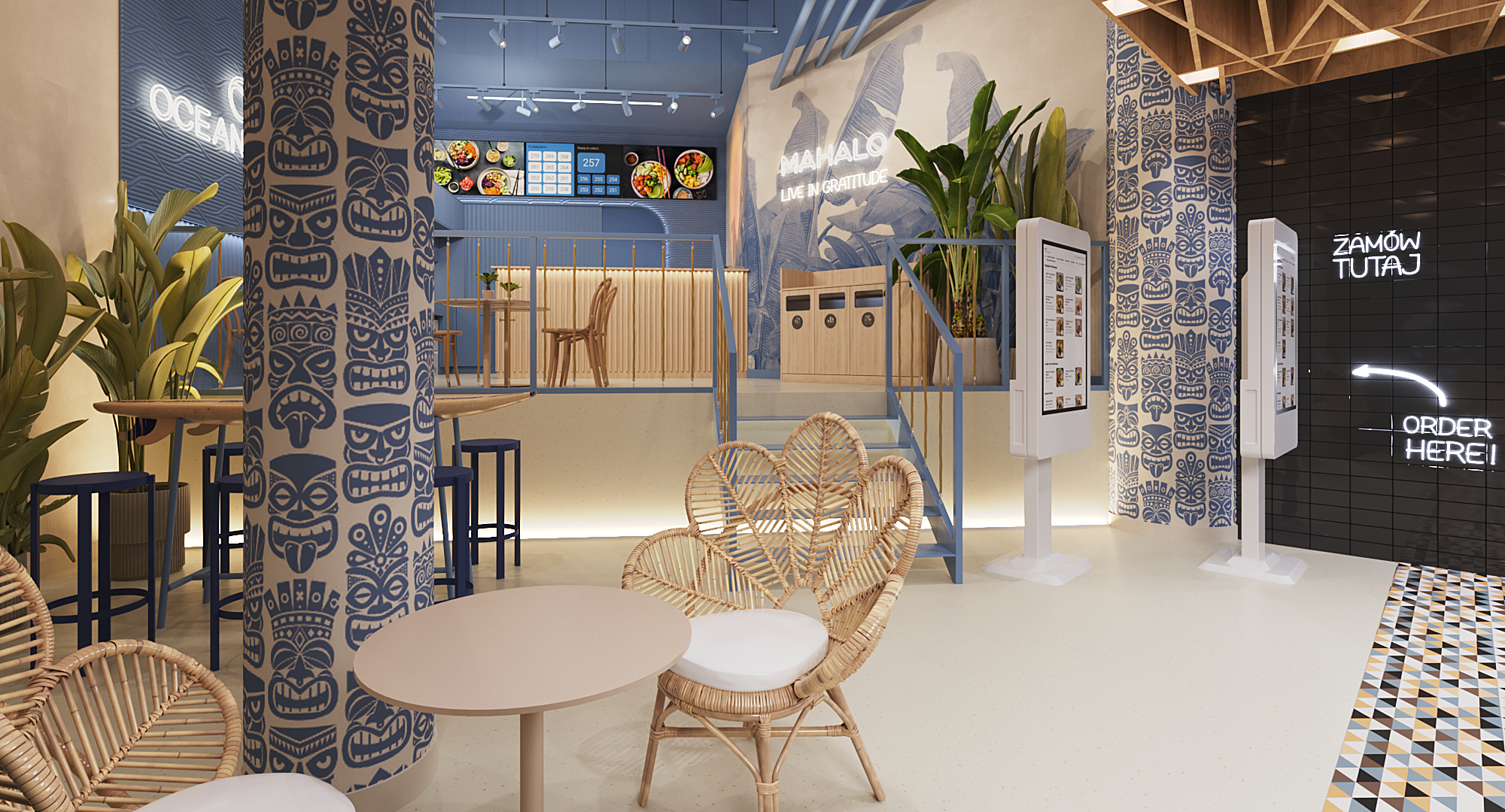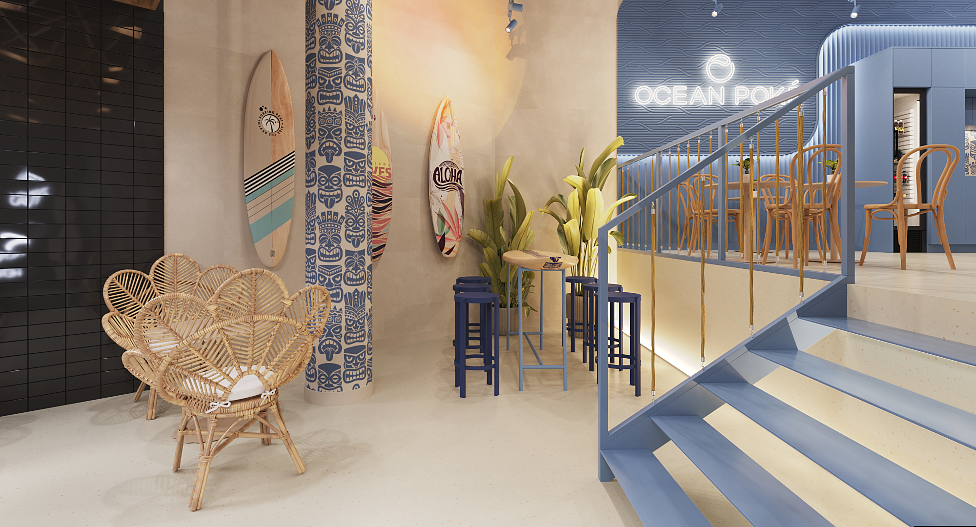 Chłodną kolorystykę przełamują elementy w odcieniach beżowego piasku. Posadzka oraz fragmenty ścian nawiązują do naturalnych barw plaży, ocieplając wnętrze i wzmacniając jego nadmorski charakter. Klimat miejsca buduje także lampa typu sunset, której ciepłe światło przypomina zachód słońca nad oceanem. We wnętrzu pojawiają się również detale inspirowane kulturą hawajską, takie jak tapeta z motywem tiki czy stół wykonany z deski surfingowej. Całość tworzy lekką, wakacyjną atmosferę, dzięki której Ocean Poke staje się nie tylko miejscem na szybki posiłek, ale też krótką podróżą w tropikalny klimat.